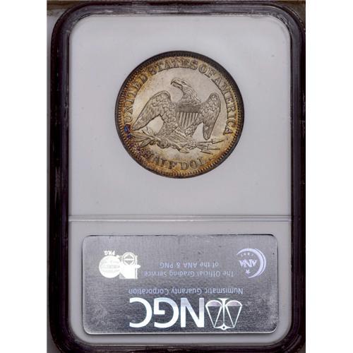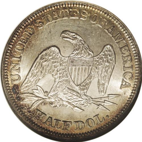 <B>1859<50C> MS65 NGC.</B></I> Boldly struck in all areas, with beautiful, mottled shades of russet, blue-green, and purple toning intermingled near the border areas on each side. Relatively few 1859 half dollars survive in Mint State grades and the Gem threshold whittles the quantity down to perhaps a dozen pieces. Census: 7 in 65, 3 finer (4/06).