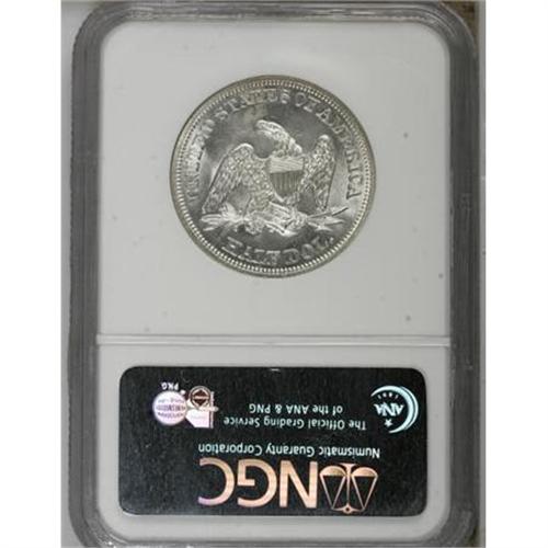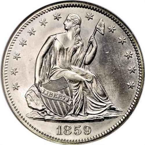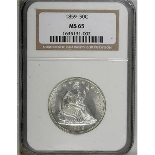 <B>1859 50C MS65 PCGS.</B></I> Type One Reverse. Blessed with a splendidly full strike, this is a fully lustrous, bright white coin whose only trace of visible color is on the rims. A few minute surface ticks appear to account for the grade, but do not adversely affect the eye appeal. Although considered a common date, this is a tough coin in Gem and finer grades. Census: 7 in 65, 3 finer (12/07).<BR><BR><B>Coin Engraver:</B> Christian Gobrecht<BR><BR><b>Shipping:</b> Coins & Currency (<a target="_blank" href="http://www.heritageauctions.com/common/shipping.php">view shipping information</a>)