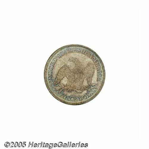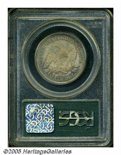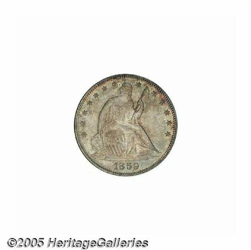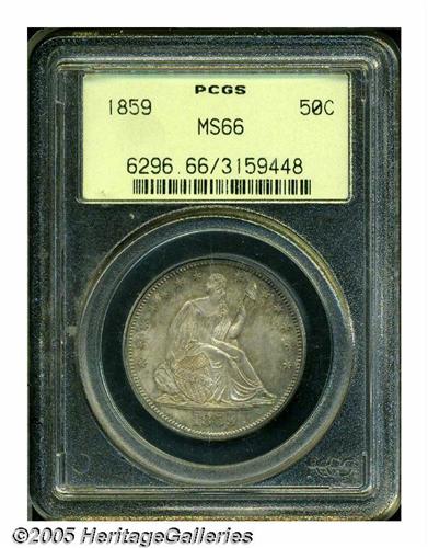 <B>1859<50C> MS66 PCGS.</B></I> A scarce and underrated P-mint Half Dollar. Although often categorized with the common No Motto issues, it is actually several times scarcer than a true common date. This specimen displays beige-gray and cobalt-blue patina over lustrous surfaces that show just a few minute contact marks on Liberty's right shoulder. The design features are well impressed throughout, as Liberty's hair and sandal reveal excellent definition. Population: 2 in 66, 0 finer (6/05).