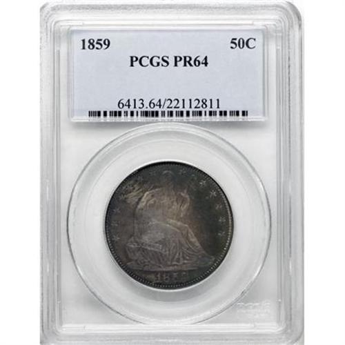 <B>1859 50C PR64 PCGS.</B></I> Type Two Reverse. Deep navy-blue and mauve fills the obverse. The reverse has similar colors, but much of the field is only lightly toned. Impressively preserved and precisely struck. Population: 36 in 64, 11 finer (10/07).<BR><I>From The Kallenberg #1 PCGS Registry Set Of Proof Half Dollars.</B></I><BR><BR><B>Coin Engraver:</B> Christian Gobrecht<BR><BR><b>Shipping:</b> Coins & Currency (<a target="_blank" href="http://www.heritageauctions.com/common/shipping.php">view shipping information</a>)