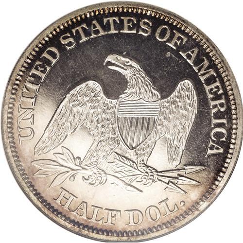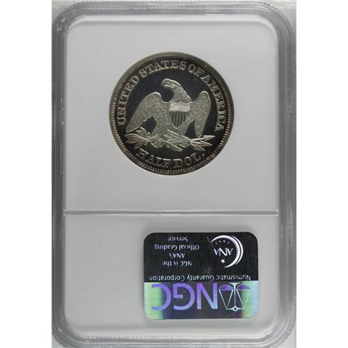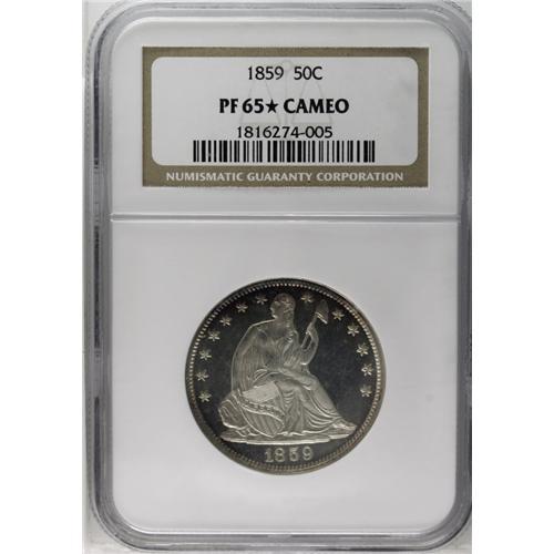 <B>1859<50C> PR65 <img border='0' src='http://www.heritagecoins.com/images/star.gif' width=10 height=10> Cameo NGC.</B></I> This eye catching specimen displays pinpoint sharpness and is framed in splendid orange and rose-violet toning that tends to accentuate the coin's impressive contrast. A few modest frost breaks on the portrait, the most notable being on Liberty's arm, are the most obvious distractions, but they are a product of striking and therefore not detrimental to the grade. The Mint's fledgling proof program in the late 1850s was a bit over-optimistic about the demand for these special strikings, and many of the 800 Half Dollars struck this year were eventually melted. Those that were distributed were often mishandled by their numismatically uneducated recipients. Population: 1 in 65 <img border='0' src='http://www.heritagecoins.com/images/star.gif' width=10 height=10> Cameo, 2 finer (6/06).<BR><I>From The Mulholland Collection.</B></I>