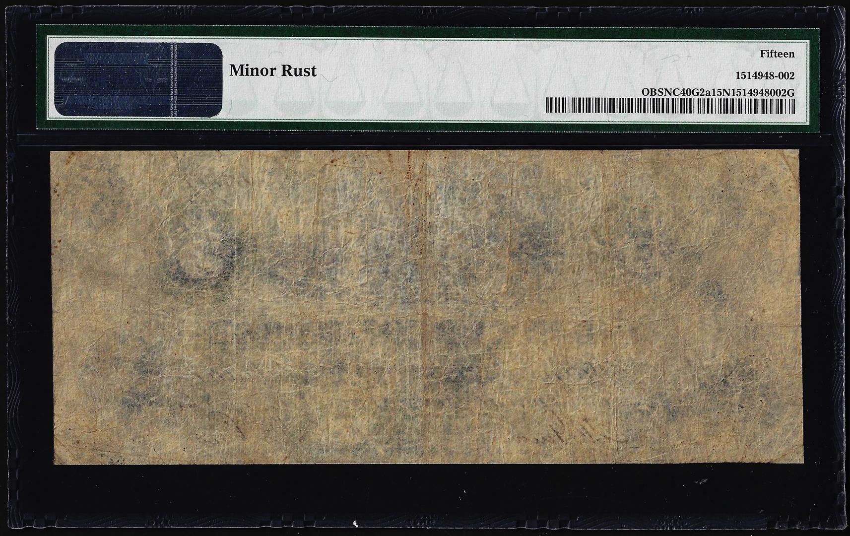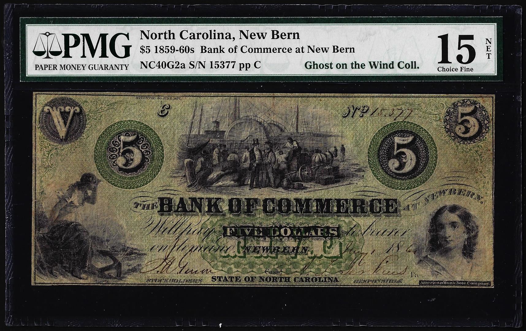 One 1859-60s $5 Bank of Commerce New Bern North Carolina Obsolete Note PMG Choice Fine 15. PMG Certified.