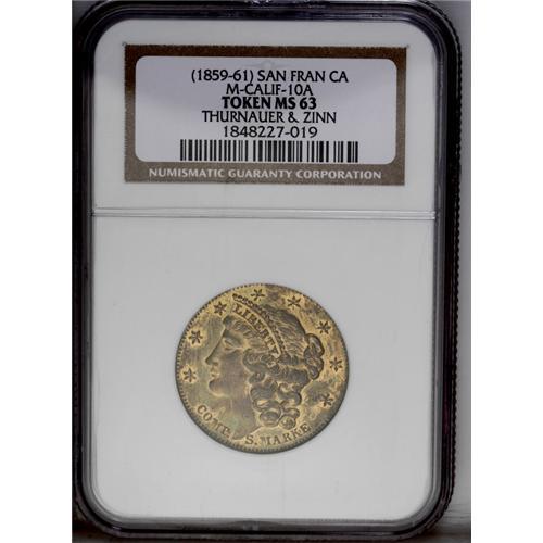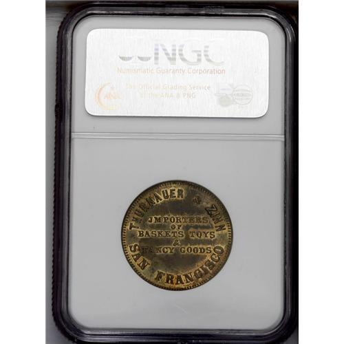 <B>(1859-61) San Francisco California Thurnauer & Zinn Token, Miller-Calif-10A, MS63 NGC.</B></I> Brass, 27.5mm, plain edge. Obverse: Coronet Liberty head left with eight stars around; Comp. S. Marke, below. Reverse: Thurnauer & Zinn / Jmporters / of / Baskets Toys / & / Tancy Goods. Below: San Francisco. The misspellings appear on the token just as represented here. Rulau believes this is the only business which could have had its counters struck before 1861, but they could have been struck later alongside the other California firms. Dark brown patina in areas of low relief on both sides.