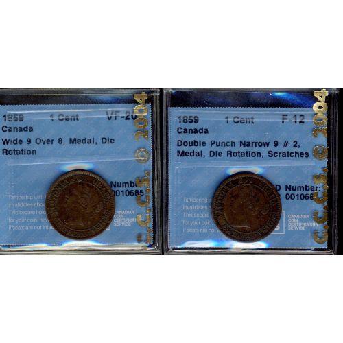 1859 8/9 1¢ CCCS VF-20 DIE ROTATION, 1859 DP#2 1¢ CCCS F-12 scrts. DIE ROTATION. Scarce. Lot of two coins