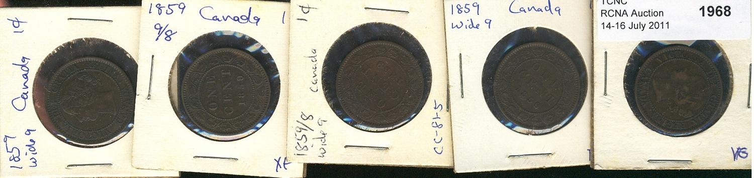 1859 8/9 1¢, lot of 5 pieces. F-12 to EF-40.