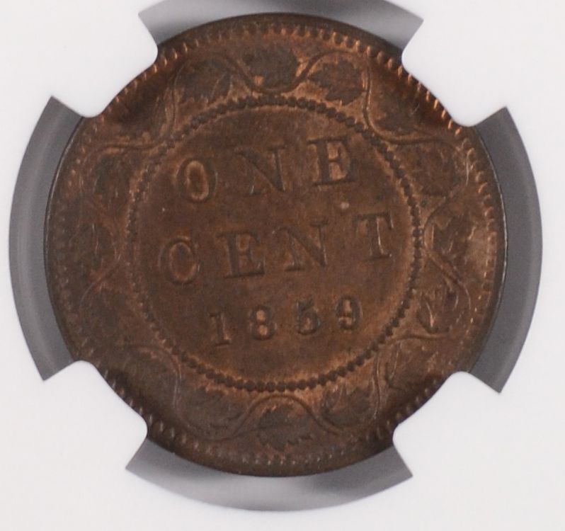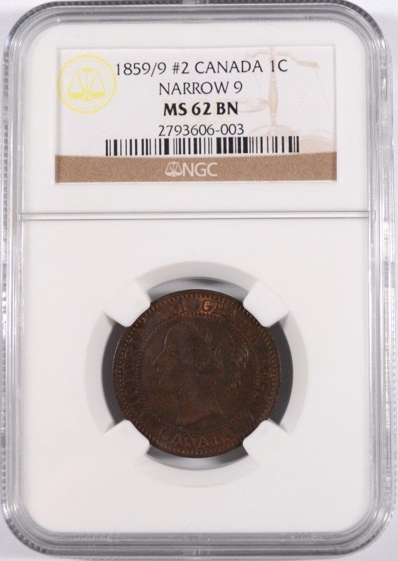 1859/9 CANADIAN CENT, NARROW-9 TYPE-2, NGC MS-62 BN RARE!!!