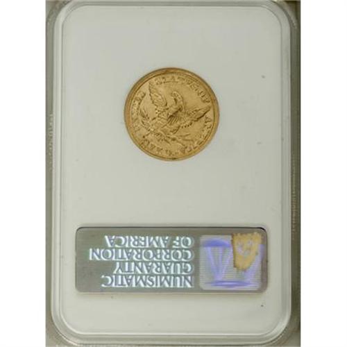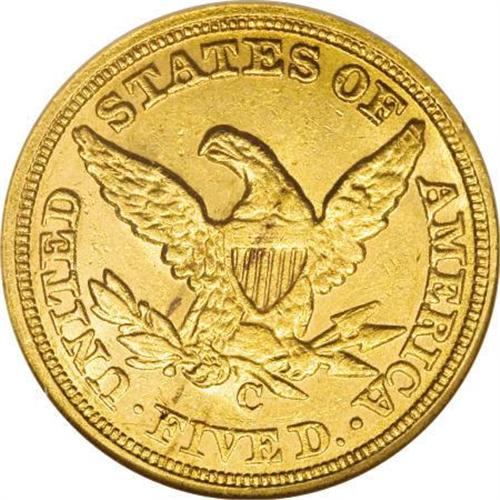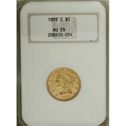 <B>1859-C $5 AU55 NGC.</B></I> Every known 1859-C has a peculiar strike with extreme weakness seen on the reverse. While this example is no exception, it actually displays better detail than about 90% of the pieces we have seen. The obverse is somewhat choppy with a number of shallow scuffs in the fields; the reverse is clean and choice with one tiny mint-made grease stain seen above the olive leaves. There is a considerable amount of mint frost seen and it appears that this coin does not have that much actual wear. Both sides have acquired light orange and rose-gold color that is pleasing, and this is certainly a very presentable example for the date and grade. Housed in an old NGC holder and conservatively graded by today's standards.<BR><I>From The Carolina Circle Collection.</B></I><BR><BR><B>Coin Engraver:</B> Christian Gobrecht<BR><BR><b>Shipping:</b> Coins & Currency (<a target="_blank" href="http://www.heritageauctions.com/common/shipping.php">view shipping information</a>)