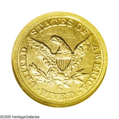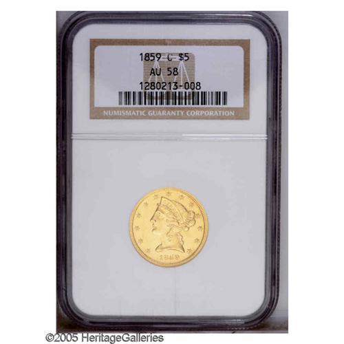 <B>1859-C<$5> AU58 NGC.</B></I> Variety 27-M. Another of the difficult Charlotte Half Eagle issues from the 1850s, although ranked in the bottom half of the series (24 dates) from the popular Southern Mint in terms of overall scarcity. Like all 1859-C Fives, this high grade representative is far better struck on the obverse than on the reverse and the bright yellow-gold surfaces retain a generous amount of original luster. Census: 30 in 58, 12 finer (11/05).<BR><I>From The Watson Collection.</B></I>