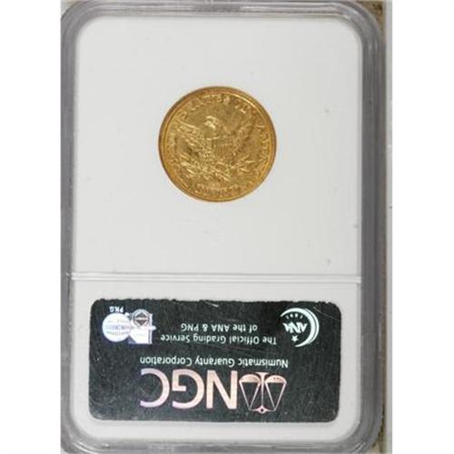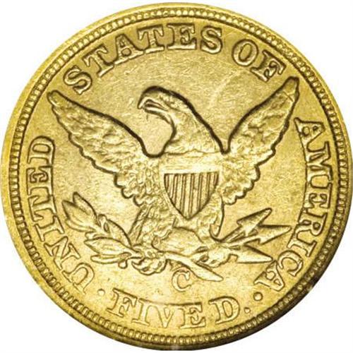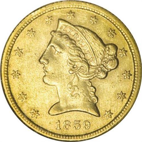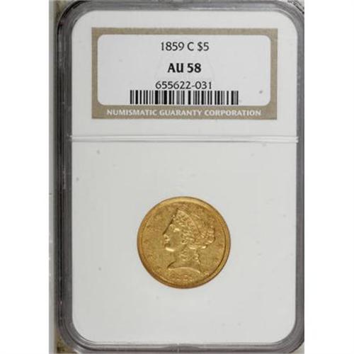 <B>1859-C $5 AU58 NGC.</B></I> Variety 27-M, the lone variety for the year. Uncommonly well-defined for this Charlotte issue, though the reverse shows a measure of softness on the eagle's talons and neck area, with luminous yellow-gold fields that show elements of orange-gold at the margins. Lightly marked overall, though the devices show just a trace of friction. NGC has graded 12 Mint State representatives, though that figure is likely padded by resubmissions (12/07).<BR><BR><B>Coin Engraver:</B> Christian Gobrecht<BR><BR><b>Shipping:</b> Coins & Currency (<a target="_blank" href="http://www.heritageauctions.com/common/shipping.php">view shipping information</a>)