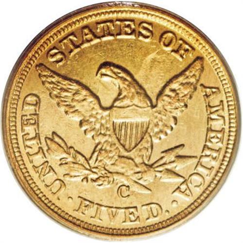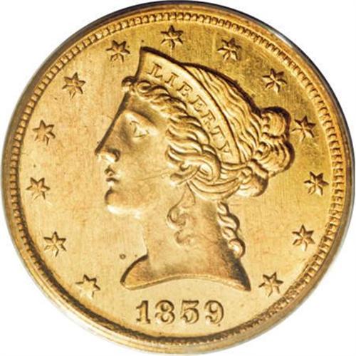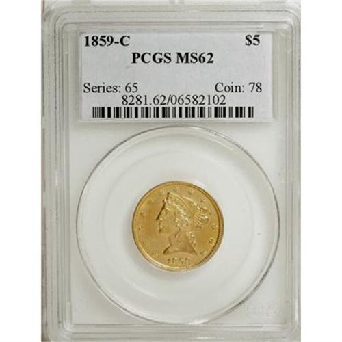 <B>1859-C $5 MS62 PCGS.</B></I> Variety 27-M. Die State II. Tied for second finest known with the MS62 in the Michigan Collection, and only bettered by the fabulous MS66 coin formerly in the Elrod and Eliasberg Collections. Sharply defined on the obverse, the reverse shows the usual softness from an improperly annealed reverse die. The obverse fields are bright and glitter with sparkling prooflike reflectivity, a result of heavy die striations on that side. Even reddish-golden toning is overlaid on both obverse and reverse. Distinguished by a tiny dark spot of color in the lower left obverse field just above the end of Liberty's bust. <BR><I>From The Waxhaw Collection.</B></I><BR><BR><B>Coin Engraver:</B> Christian Gobrecht<BR><BR><b>Shipping:</b> Coins & Currency (<a target="_blank" href="http://www.heritageauctions.com/common/shipping.php">view shipping information</a>)
