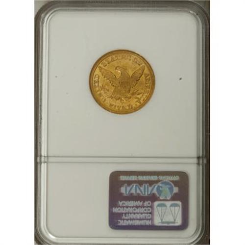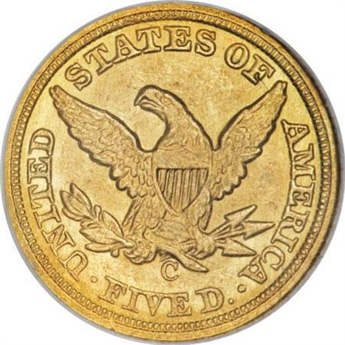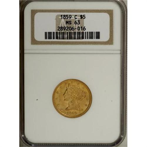 <B>1859-C $5 MS63 NGC.</B></I> Variety 27-M, the only known die pair for the 1859-C half eagle. The 1859-C is not particularly rare in circulated grades but any Mint State piece is a major rarity. Grading these coins is a challenge, due to the physical characteristics. The reverse is always weak, due to a poorly prepared reverse die. It seems that the hub failed to make a complete impression. Perhaps the die was only hubbed once, instead of twice. Whatever the reason, the poor appearance of the die was transferred to each coin struck from it.<BR> In his Charlotte Gold book, Doug Winter traces just five Mint State examples of the 1859-C half eagle. The five coins include the Eliasberg coin, now PCGS certified MS66 and far finer than any other; the "Elrod Duplicate" that is NGC graded MS63; the North Georgia Collection PCGS MS62; the Pittman coin, NGC graded MS62; and the Winter plate coin, PCGS MS60. The present piece may be one of the five, or perhaps a new appearance. As the single finest example that NGC has certified, it is likely that this coin is the "Elrod Duplicate" specimen.<BR> The obverse has impressive green-gold color, with traces of faint blue accents. The reverse is similar, with slight orange tendencies. The design elements are essentially full, except for slight weakness as described on the reverse. This is one of the finest specimens to come on the market, and it should receive considerable bidding activity.<BR><BR><B>Coin Engraver:</B> Christian Gobrecht<BR><BR><b>Shipping:</b> Coins & Currency (<a target="_blank" href="http://www.heritageauctions.com/common/shipping.php">view shipping information</a>)