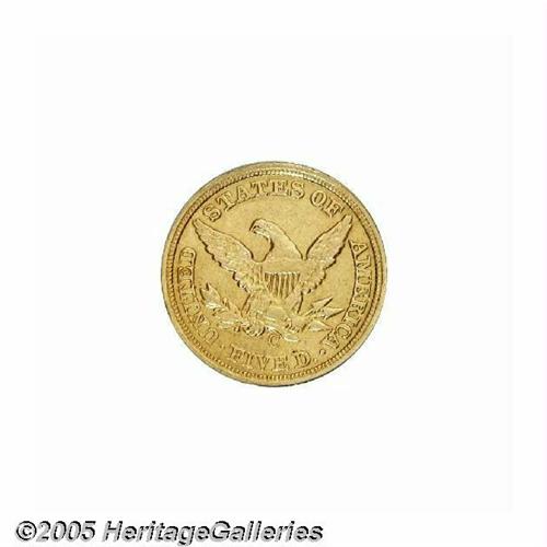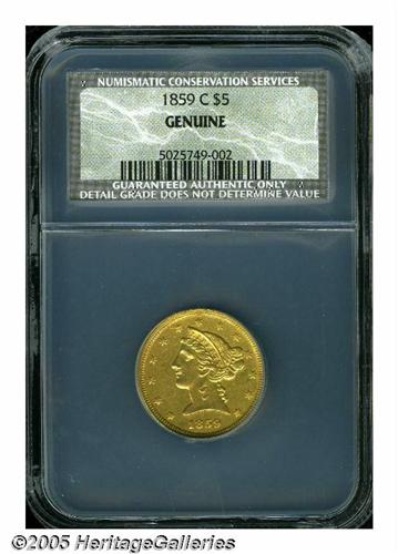 <B>1859-C<$5> NCS Genuine (AU50 Cleaned).</B></I> Variety 27-M. A single pair of dies was used for the entire year. Well struck on the obverse with sharp details on Liberty's curls, the reverse is typically weaker, as nearly always seen on this issue. This coin has been cleaned as the surfaces are now a bit dull. With the reported mintage of 31,847 it is easy to see why few are known today. This particular piece has likely been in coin collections virtually since the time it was struck, but in prior generations the science of cleaning coins was not as advanced as found today. A coin that should please most collectors despite the minor problem.