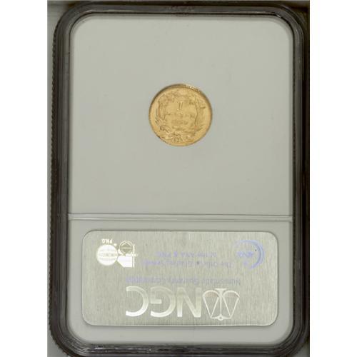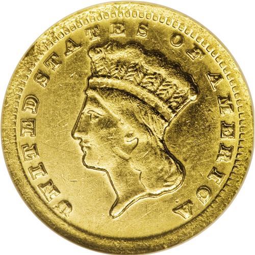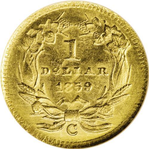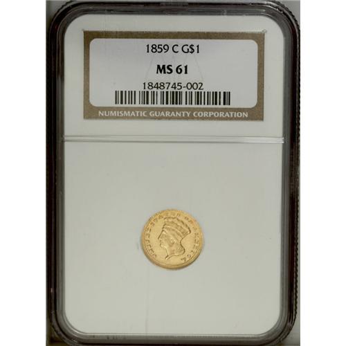 <B>1859-C G$1 MS61 NGC.</B></I> Variety 11-M. A smooth and shimmering rare date C-mint gold dollar. The almond-gold surfaces are radiant and lack relevant marks. The wreath is well struck, and the portrait has pleasing definition despite a couple of minor mint-made strike-throughs. The mintmark is bold, and the date is sharp aside from the lowest portion of the 8. The rims are occasionally softly brought up. A scant 5,235 pieces were struck, and there are insufficient Mint State survivors to meet the demand from the many collectors of this popular North Carolina mint. Census: 5 in 61, 14 finer (10/06).<BR><BR><b>Shipping:</b> Coin/Currency (<a target="_blank" href="http://www.heritageauctions.com/common/shipping.php">view shipping information</a>)