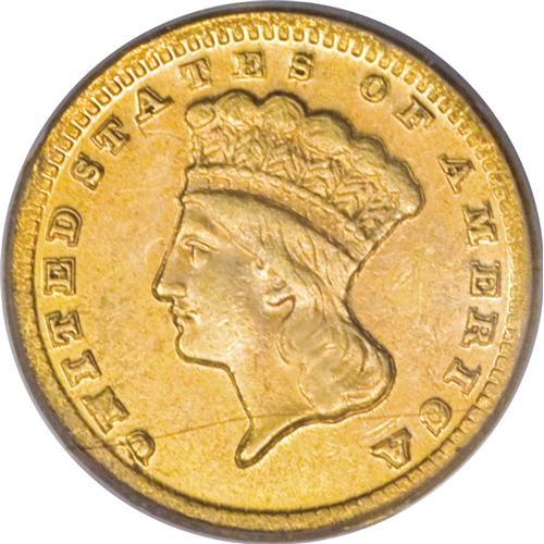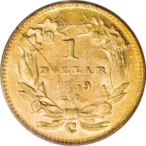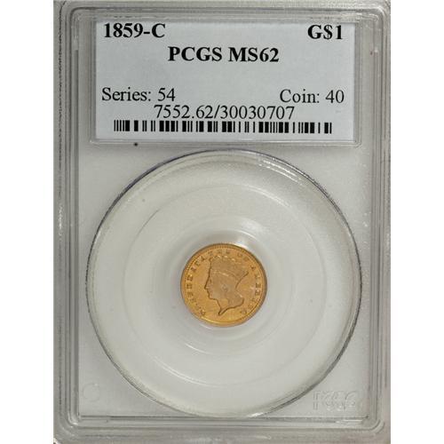 <B>1859-C G$1 MS62 PCGS.</B></I> Variety 11-M. Generally poorly struck and produced from inferior planchet stock, the '59-C has become a real challenge for collectors to locate in problem-free condition in any grade. The center of the reverse is weakly defined on this piece as are the hair curls on Liberty. However, the satiny surfaces are remarkably free from any large or distracting abrasions. Mint State pieces are genuinely scarce, and MS63 is the top grade level that a mere three examples have achieved, all three at PCGS. This MS62 offering represents a conditionally elite group. Population: 3 in 62, 3 finer (3/07).<BR><BR><b>Shipping:</b> Coins & Currency (<a target="_blank" href="http://www.heritageauctions.com/common/shipping.php">view shipping information</a>)