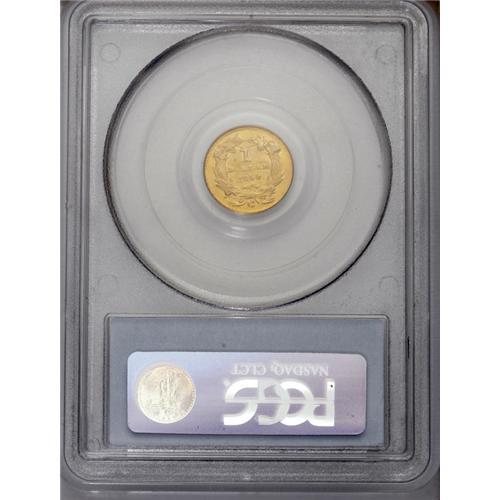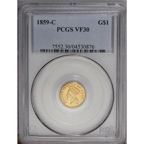 <B>1859-C G$1 VF30 PCGS.</B></I> Variety 11-M. A richly detailed if glossy lemon-gold Charlotte Gold Dollar, the final issue of that denomination from the North Carolina branch mint. A light diagonal pinscratch crosses the cheek and continues toward 5 o'clock, but no other issues are detected. Only 5,235 pieces were struck.<BR><I>From The Carolina Gold Collection, Part Two.</B></I>