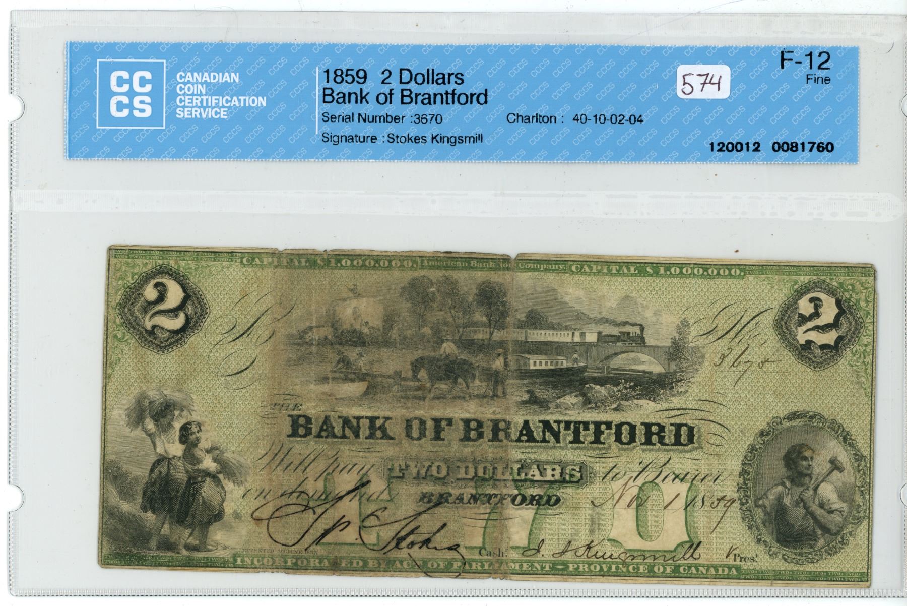 1859 CCCS Graded, "Bank of Brantford" Canadian 2 dollar bill - 3670 - F12