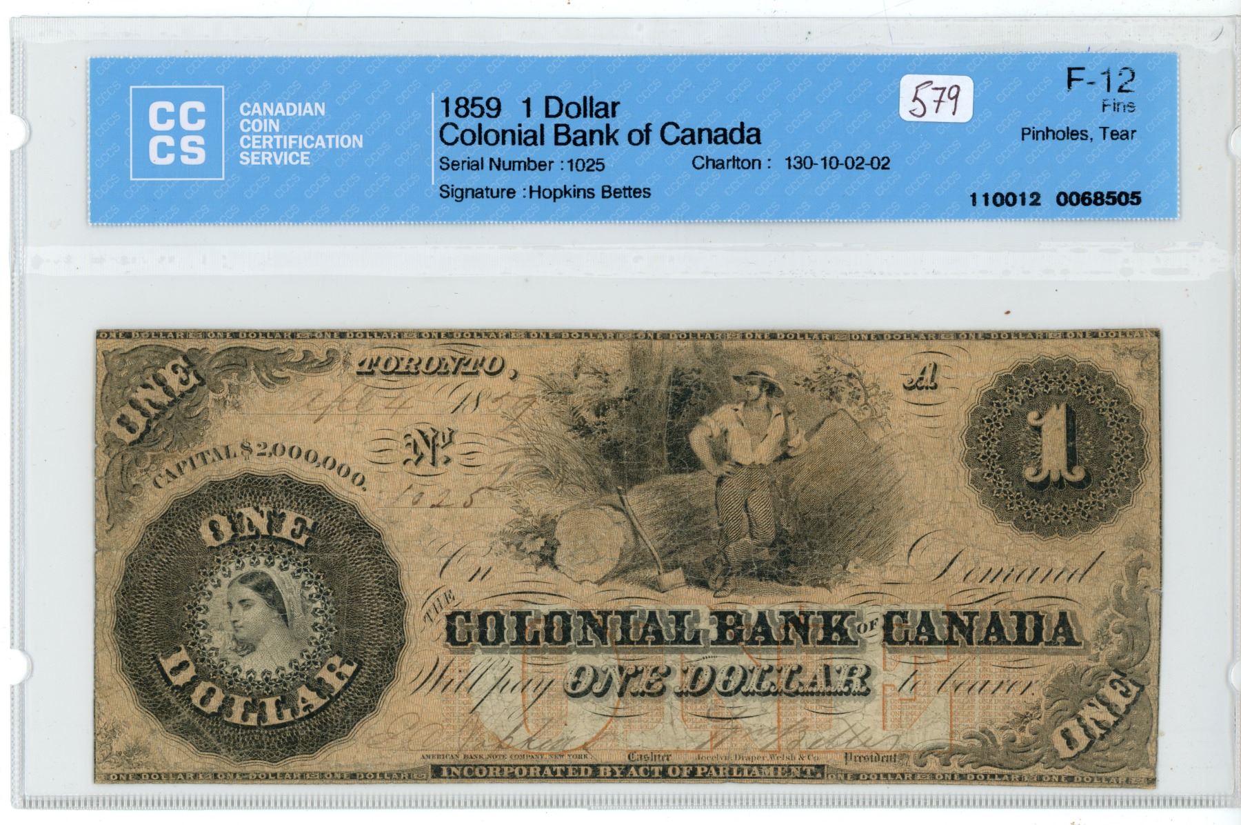 1859 CCCS Graded, "Colonial Bank of Canada" Canadian 1 dollar bill - F12