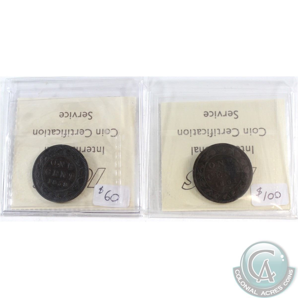 1859 Canada 1-cent Wide 9/8 ICCS Certified VG-10 & 1891 1-cent LL SD Obverse 2 VG-8. 2pcs