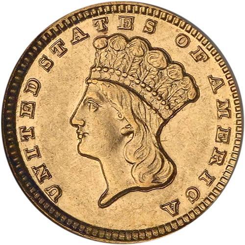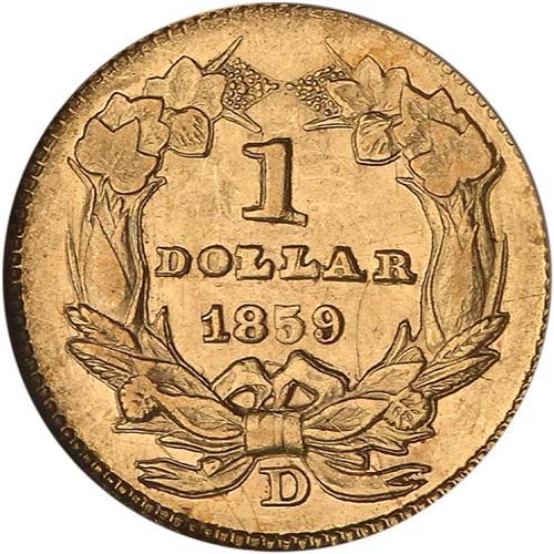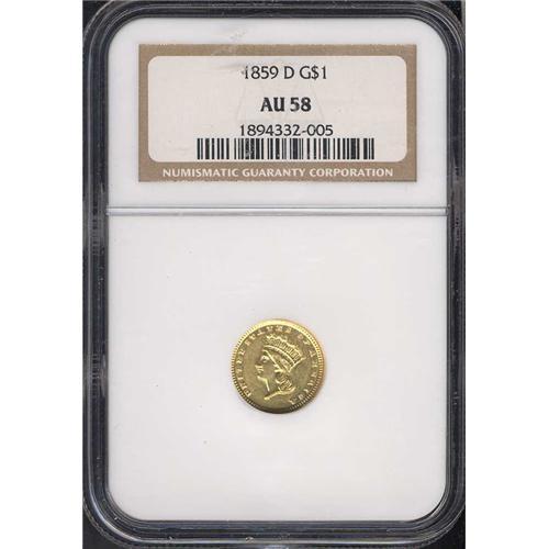 Mintage of only 4952. All with Narrow numbers in the date and a Large D Mint Mark. This one has a doubled profile of Liberty and completely doubled letters in UNITED STATES OF AMERICA and DOLLAR. Bright, almost Proof-Like in appearance. Usually poorly struck but this example is Well Struck. Quite choice for the grade. Bids $4700 and trends $8000.