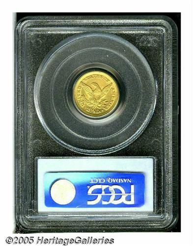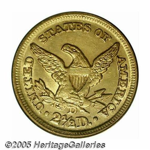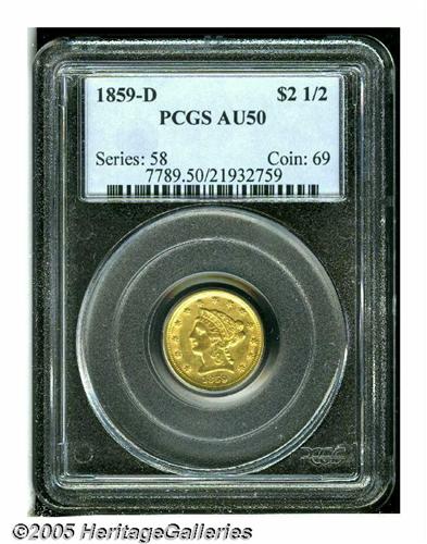 <B>1859-D<$2 1/2> AU50 PCGS.</B></I> Variety 21-M. This is the final Quarter Eagle struck at the Dahlonega Mint, and it is on of just 2,244 coins produced. There are actually a surprising number of survivors, given the mintage. It is estimated by Doug Winter that 120 to 140 examples remain today, representing more than 5% of the mintage. The typical example, according to Winter, is XF or AU quality. This example is a splendid one with frosty yellow-gold luster and outstanding surfaces. It is typically struck with the hair beneath the coronet weakly defined, as well as the eagle's right leg. Most of the other design details are quite bold.<BR><I>From the Dr. Kurt Peters Collection.</B></I> From the Dr. Kurt Peters Collection.