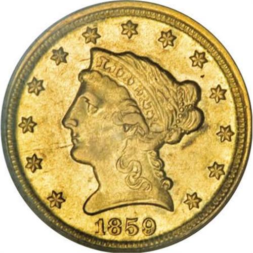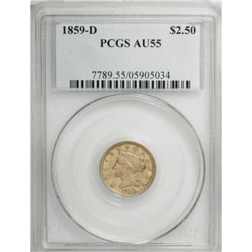 <B>1859-D $2 1/2 AU55 PCGS.</B></I> Variety 21-M. Semi-prooflike fields establish mild contrast with the lightly frosted design elements. The peripheries are sharply struck, but the usual weakness shows in the central areas, especially on the reverse. A few minor circulation marks occur over each side. Population: 23 in 55, 32 finer (12/07).<BR><BR><B>Coin Engraver:</B> Christian Gobrecht<BR><BR><b>Shipping:</b> Coins & Currency (<a target="_blank" href="http://www.heritageauctions.com/common/shipping.php">view shipping information</a>)
