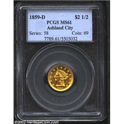 1859-D $2 1/2 MS61 PCGS. Winter 21-L. The final year of Quarter Eagle production at the Dahlonega Mint and a sought-after issue of just 2,244 pieces. The 1859-D, like the 1857-D, is perhaps not as difficult as the tiny mintage would suggest. Many of the known examples are concentrated in the XF and AU grade range, but Mint State coins are of the utmost rarity and desirability. The typical 1859-D Quarter Eagle is hampered by planchet laminations and grease stains. This highly lustrous example is much above-average in that respect, displaying rich golden coloration, strong definition on all but the eagle's left leg feathers and right talons, and scattered spotting on the reverse. One of two Mint State examples in this impressive collection and easily Condition Census. Population: 3 in 61, 2 finer (10/02). From the Ashland City Collection. Important notice: We expect to be auctioning lots at the rate of 200-250 per hour. Sometimes eBay Premier live bid software cannot keep up with that pace, so we strongly recommend that you place a realistic proxy bid now as insurance to avoid disappointment. Also please note that all Heritage/CAA lots purchased through eBay Premier carry a 20% Buyer's Premium. Please make sure you read the Terms and Conditions.