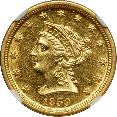 1859-D $2.50 Liberty. NGC graded MS-61 PQ. A splendid deep bold impression with intensely lustrous surfaces throughout. An untoned beauty and a Premium Quality coin for the grade. One of the key rarities in the Dahlonega mint series. Only 2,244 minted. An exceptional specimen, a Condition Census piece. First of all, the grade is far from the usual Very Fine or Extremely Fine 1859-D, and in fact, it ranks close to the highest echelon. Further, and perhaps as important, the coin has a far above average strike. Scholars have made special note that the dentils of the various C and D mint quarter eagles and few are this separated and distinguishable, this being different than the typical mushy coin. In addition, the piece has a beautiful overall aesthetic appeal -- a splendid specimen.
