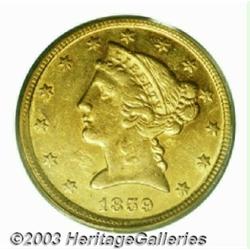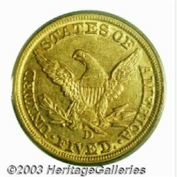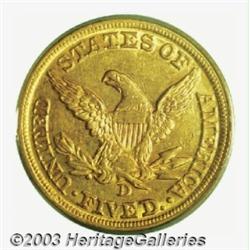 1859-D $5 Large D AU58 PCGS. Ex: Bass. Large mintmark. Variety 37-EE. (per Doug Winter's second edition and revised attribution system). This variety appears to be very rare, especially in high grades.RARITY INFORMATION: When Doug Winter's first edition of "Gold Coins of the Dahlonega Mint 1838-1861" was published in 1997, this variety was not listed. But it was apparently known to Harry Bass who had purchased an example in the 1982 Eliasberg Collection Sale. The 1859-D large mintmark is listed in the second edition of Winter's book and it appears to be very rare. The present coin is the only relatively high grade coin we know of. PCGS has also graded one example in VF and one in XF40. Since this is a relatively new discovery, it is too early to make definitive pronouncements about its rarity. But it seems highly likely that the present coin is the finest known by a considerable margin.For the collector who appreciates pedigrees, it is interesting to note the complete chain of ownership listed below. This is one of a small handful of coins owned by both Harry Bass and Louis Eliasberg, two of the greatest United States gold coin collectors of all time.STRIKE: The obverse is somewhat softly struck. On the small number of 1859-D large mintmark half eagles we have seen, this softness was also observed. The reverse shows better detail with some weakness in the center.SURFACES: Some light, scattered marks can be seen in the fields including one small dig near the left end of the bust. When the coin is tilted at an angle, several tiny marks are visible at the right corner of Liberty's eye.LUSTER: A good amount of soft frosty luster remains on both obverse and reverse.COLORATION: Both sides have lovely original rich orange-gold hues. This coin has clearly never been dipped. It is very hard to locate any 1859-D half eagle with natural color.EYE APPEAL: This is a pretty, original coin with good color. What makes it especially desirable, in our opinion, is its combination of superb pedigree and the fact that it is probably the finest known of a very rare and important variety.COMPARABLES: No other comparable 1859-D large mintmark half eagle has appeared at auction in recent years--if ever.PEDIGREE: Obtained via Doug Winter from the Bowers and Merena October 1999 Bass II Sale, lot 1117, where it realized $5,520. Earlier Ex: Harry Bass Collection; Eliasberg Collection (Bowers and Ruddy, 10/82), lot 494; John Clapp Jr.; John Clapp Sr.; J.C. Mitchelson in 1905. Important notice: Heritage usually auctions material at the rate of 200-250 lots per hour. On some occasions eBay Live bid software or the Internet may not be able to keep up with the pace of the auction. We recommend placing a realistic absentee bid now as insurance to avoid disappointment. Occasionally the auctioneer may eliminate or reject an eBay Live bid, and the auctioneer may also reopen a lot after the close of the eBay live bidding (usually because we missed an audience bid), and may reject your bid even if it shows you as the winning bidder. By bidding via eBay Live, you agree that Heritage may award the lot to another bidder at its sole discretion under the circumstances described above or any other reasonable circumstances. Also please note that all Heritage lots purchased through eBay Live carry a 20% Buyer's Premium. Please make sure you read the Terms and Conditions before you bid.