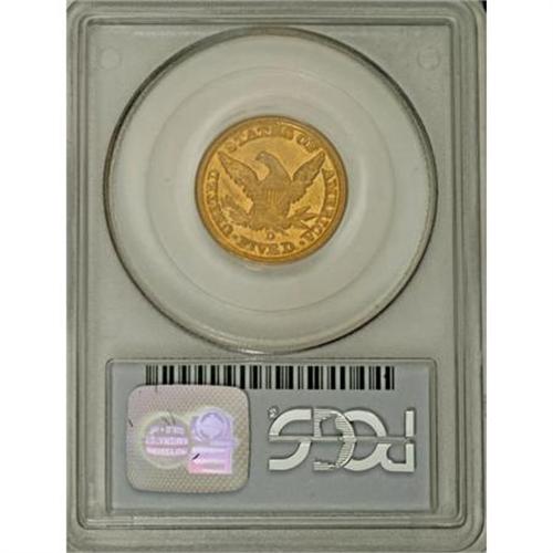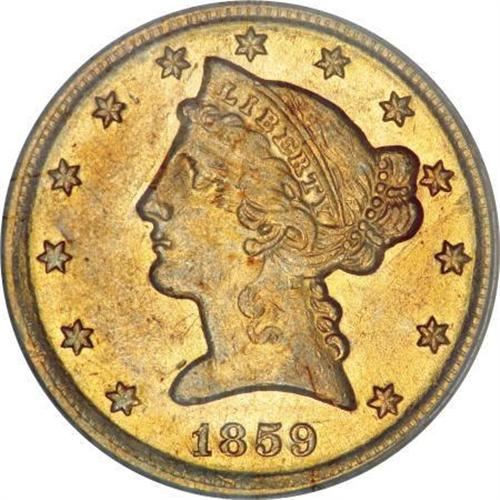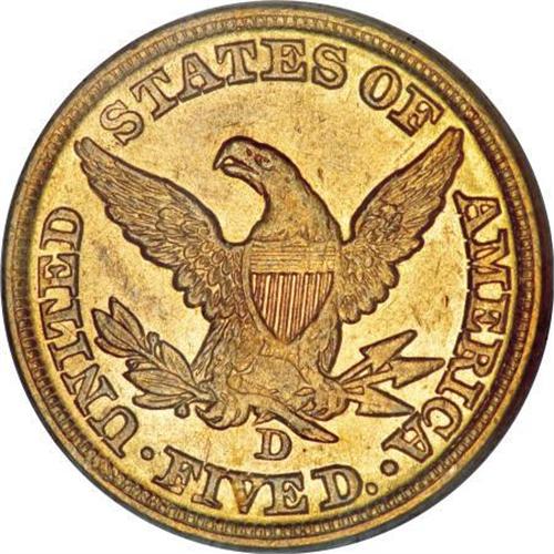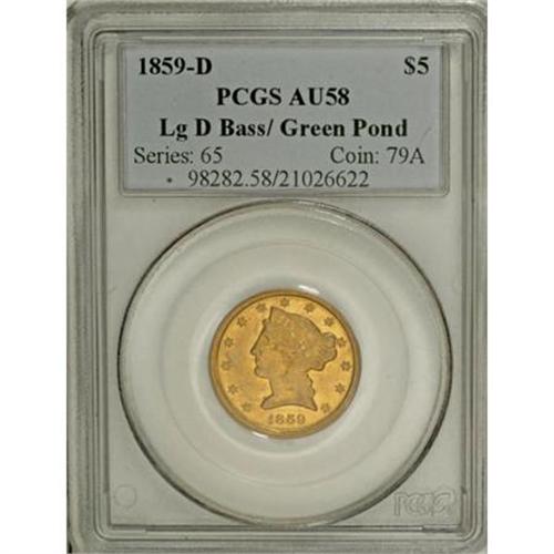 <B>1859-D $5 Large D AU58 PCGS.</B></I> Ex: Bass/Green Pond. Variety 37-EE. This is an extremely rare variety, especially in high grades. It is possible that the present piece is the finest representative that has survived since they were coined. Although the Large D variety has only recently come to the attention of specialists, Harry Bass purchased this example from the famous Eliasberg Collection. Apparently, Bass recognized it as something special. It also carries a pedigree back to the turn of the 20th century. <BR> The obverse is somewhat softly struck. On the small number of 1859-D large mintmark half eagles we have seen, this softness was also observed. The reverse shows better detail with some weakness in the center. Some light, scattered marks can be seen in the fields including one small dig near the left end of the bust. When the coin is tilted at an angle, several tiny marks are visible at the right corner of Liberty's eye. A good amount of soft frosty luster remains on both obverse and reverse. Both sides have lovely original rich orange-gold hues. This coin has clearly never been dipped. It is very hard to locate any 1859-D half eagle with natural color.<BR> This is a pretty, original coin with good color. What makes it especially desirable, in our opinion, is its combination of superb pedigree and the fact that it is probably the finest known of a very rare and important variety.<BR><I>Ex: J.C. Mitchelson (1905); John Clapp, Sr.; John Clapp, Jr.; Clapp Estate, via Stack's (1942); Louis Eliasberg, Sr.; Eliasberg Estate (Bowers and Ruddy, 10/1982), lot 494; Harry W. Bass, Jr. (Bowers and Merena, 10/1999), lot 1117; Green Pond Collection (Heritage, 1/2004), lot 1063.</B></I><BR><BR><b>Shipping:</b> Coins & Currency (<a target="_blank" href="http://www.heritageauctions.com/common/shipping.php">view shipping information</a>)