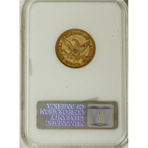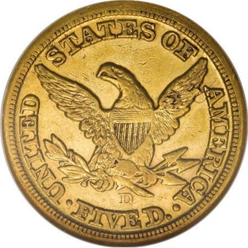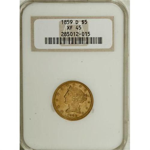 <B>1859-D $5 Medium D XF45 NGC.</B></I> Variety 36-CC. The usual Winter variety for this low mintage issue. A partly lustrous apricot-gold Dahlonega five that has only one mark of any consequence, a brief pinscratch beneath the jaw. The eagle's neck and Liberty's hair are typically brought up, but the remainder of the design is bold.<BR><I>From The Vanek Collection.</B></I><BR><BR><b>Shipping:</b> Coins & Currency (<a target="_blank" href="http://www.heritageauctions.com/common/shipping.php">view shipping information</a>)