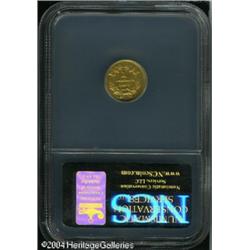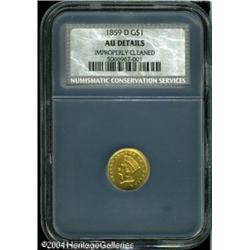 1859-D G$1 AU50 Details, Improperly Cleaned, NCS. <B>1859-D G$1 AU50 Details, Improperly Cleaned, NCS.</B></I> While a scarce date when placed in the context of the gold dollar series, the 1859-D is actually one of the more commonly encountered Type Three Dahlonega dates. However, all known specimens are poorly produced with weak center digits in the date. This coin is remarkably well struck on the obverse, but displays the usual softness on the reverse. Somewhat unnaturally bright surfaces with only a few small marks. <BR><BR><B>Important notice:</B> Heritage usually auctions material at the rate of 200-250 lots per hour. On some occasions eBay Live bid software or the Internet may not be able to keep up with the pace of the auction. We recommend placing a realistic absentee bid now as insurance to avoid disappointment. Occasionally the auctioneer may eliminate or reject an eBay Live bid, and the auctioneer may also reopen a lot after the close of the eBay live bidding (usually because we missed an audience bid), and may reject your bid even if it shows you as the winning bidder. By bidding via eBay Live, you agree that Heritage may award the lot to another bidder at its sole discretion under the circumstances described above or any other reasonable circumstances. Since eBay bids are not shown to us until we open the lot on the floor, we treat those bids just like floor bids. In most cases the floor responds before the eBay bid is presented to us, due to Internet lag time, so for consistency we have made it a policy that floor bids are always considered first over tie eBay live bids. Also please note that all Heritage lots purchased through eBay Live carry a 20% Buyer's Premium. Please make sure you read the Terms and Conditions before you bid. This lot is being auctioned in conjunction with a live floor auction by Heritage Galleries & Auctioneers. All final auction and invoice information will be supplied by Heritage Galleries & Auctioneers, and all other information should be considered preliminary. Lot:6464