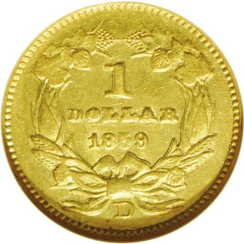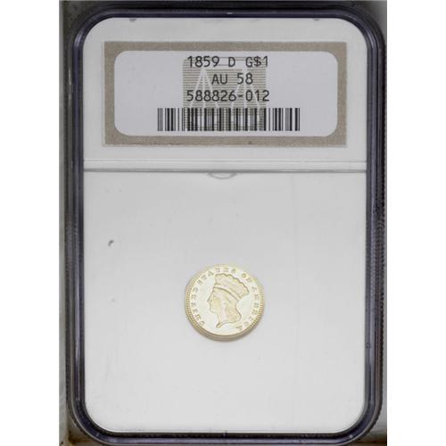 <B>1859-D<G$1> AU58 NGC.</B></I> Variety 11-N, the more obtainable of two die pairings. Here the 9 in the date is centered below the left edge of the A in DOLLAR. The 1859-D, while perhaps not as scarce as its small mintage of 4,952 pieces might suggest, is nevertheless a challenging and eminently collectible issue from the historic Dahlonega Mint. Much of the original luster survives on this pleasing reddish-golden example and only isolated weakness is seen at the center of the reverse. Census: 34 in 58, 35 finer (3/06).<BR><I>From The Steve Glenn Collection.</B></I> <BR><BR><B>Important notice:</B> Heritage usually auctions material at the rate of 200-250 lots per hour. On some occasions eBay Live bid software or the Internet may not be able to keep up with the pace of the auction. We recommend placing a realistic absentee bid now as insurance to avoid disappointment. Occasionally the auctioneer may eliminate or reject an eBay Live bid, and the auctioneer may also reopen a lot after the close of the eBay live bidding (usually because we missed an audience bid), and may reject your bid even if it shows you as the winning bidder. By bidding via eBay Live, you agree that Heritage may award the lot to another bidder at its sole discretion under the circumstances described above or any other reasonable circumstances. Since eBay bids are not shown to us until we open the lot on the floor, we treat those bids just like floor bids. In most cases the floor responds before the eBay bid is presented to us, due to Internet lag time, so for consistency we have made it a policy that floor bids are always considered first over tie eBay live bids. Also please note that all Heritage lots purchased through eBay Live carry a 20% Buyer's Premium. Please make sure you read the Terms and Conditions before you bid. This lot is being auctioned in conjunction with a live floor auction by Heritage Galleries & Auctioneers. All final auction and invoice information will be supplied by Heritage Galleries & Auctioneers, and all other information should be considered preliminary. Lot:2297 <BR><BR><B>Winning Notification and Billing:</B> After the FINAL session in this auction is complete, Heritage will send e-mail and snail mail invoices. This process normally takes several days. All final auction and invoice information will be supplied by Heritage Galleries & Auctioneers, and all other information should be considered preliminary. <BR><BR>This auction will be conducted on a live auction floor and over the Internet through eBay Live. If you choose to place an absentee bid, please take a moment to <font color='#0000ff'><u><a href='http://pages.ebay.com/liveauctions/help/before/laabsentee.html'>learn how eBay Live absentee bidding works</a></u></font><font color='#000000'>