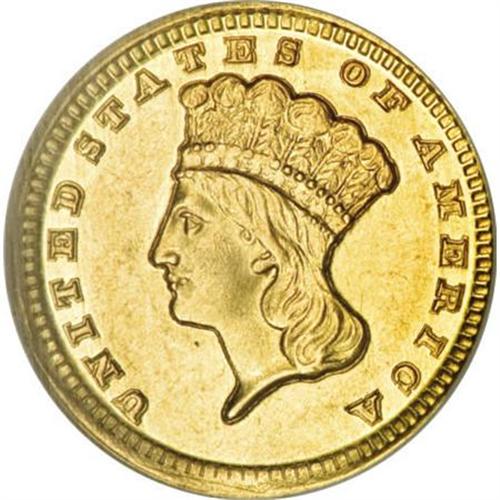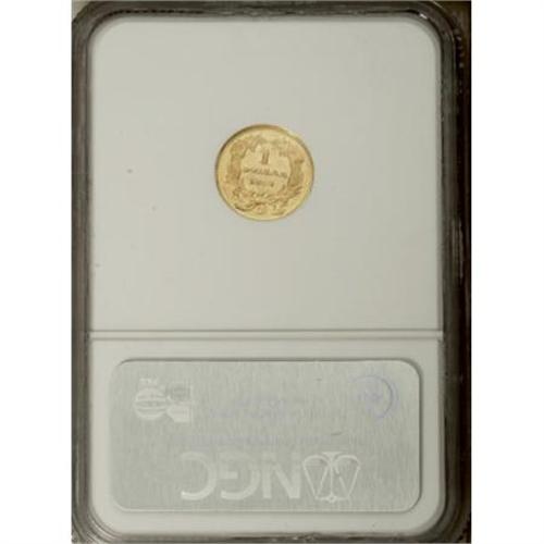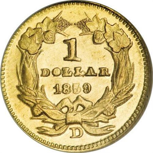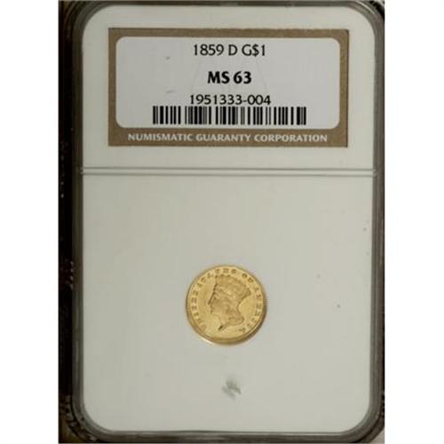 <B>1859-D G$1 MS63 NGC.</B></I> Variety 11-N. Survivors of this issue are probably the most frequently encountered Dahlonega Mint Type Three gold dollars, but most of them only grade about AU50 or AU55. Relatively few Mint State examples have been certified, a couple of dozen pieces each at NGC and PCGS. Light clash marks are noted on the both sides. The pretty surfaces are medium golden-yellow, and the central reverse details, the 85 in the date, are somewhat mushy but legible (on some examples, those numbers are completely missing). Some light field chatter accounts for the grade, but there are no singular contact marks. Census: 8 in 63, 6 finer (12/07).<BR><BR><B>Coin Engraver:</B> James B. Longacre<BR><BR><b>Shipping:</b> Coins & Currency (<a target="_blank" href="http://www.heritageauctions.com/common/shipping.php">view shipping information</a>)