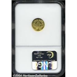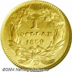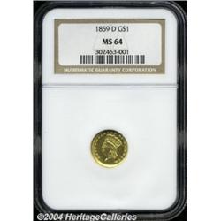 <B>1859-D<G$1> MS64 NGC.</B></I> Variety 11-N, the 9 in the date is centered below the left edge of the A in DOLLAR. From 1854 through the outbreak of the Civil War, the Dahlonega Mint's yearly output of Gold Dollars failed to reach 5,000 coins. The 1859-D has one of the more generous deliveries of this era. Nevertheless, only 4,952 pieces were produced, and it is a rare occasion when a Mint State survivor is offered. The major devices are well struck on this honey-gold near-Gem, and the borders are also crisp. Only the 5 in the date and the OLL in DOLLAR are not fully impressed, which is characteristic of the denomination since these letters are opposite the center of the high relief portrait. The shimmering fields are pleasantly unabraded, and the eye appeal is undeniable. Population: 3 in 64, 1 finer (6/04). <BR><BR><B>Important notice:</B> Heritage usually auctions material at the rate of 200-250 lots per hour. On some occasions eBay Live bid software or the Internet may not be able to keep up with the pace of the auction. We recommend placing a realistic absentee bid now as insurance to avoid disappointment. Occasionally the auctioneer may eliminate or reject an eBay Live bid, and the auctioneer may also reopen a lot after the close of the eBay live bidding (usually because we missed an audience bid), and may reject your bid even if it shows you as the winning bidder. By bidding via eBay Live, you agree that Heritage may award the lot to another bidder at its sole discretion under the circumstances described above or any other reasonable circumstances. Since eBay bids are not shown to us until we open the lot on the floor, we treat those bids just like floor bids. In most cases the floor responds before the eBay bid is presented to us, due to Internet lag time, so for consistency we have made it a policy that floor bids are always considered first over tie eBay live bids. Also please note that all Heritage lots purchased through eBay Live carry a 20% Buyer's Premium. Please make sure you read the Terms and Conditions before you bid. </span></font></tr></table></td></tr></table>