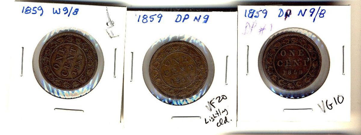 1859 DP N9 #1 VG10, 1859 W9/8 F12, 1859 N 9 1¢ VF20. Lot of 3 coins,