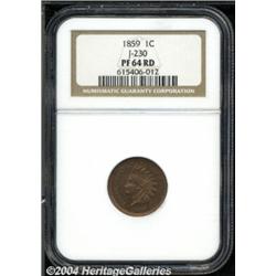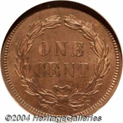 <B>1859<DT1C> Indian Cent, Judd-230, Pollock-274, High R.7, PR64 Red NGC.</B></I> Die trials of the regular issue 1859 Indian Cent, struck in copper with a plain edge. The dies have medal alignment, opposite of the usual coin turn encountered on the common copper-nickel examples of the issue. This needle-sharp near-Gem offers deep pumpkin-orange with occasional lilac hues. A couple of tiny planchet flaws (as made) along the reverse border and a faint handling mark on the neck do not reduce the eye appeal of this rare die trial specimen. <BR><BR><B>Important notice:</B> Heritage usually auctions material at the rate of 200-250 lots per hour. On some occasions eBay Live bid software or the Internet may not be able to keep up with the pace of the auction. We recommend placing a realistic absentee bid now as insurance to avoid disappointment. Occasionally the auctioneer may eliminate or reject an eBay Live bid, and the auctioneer may also reopen a lot after the close of the eBay live bidding (usually because we missed an audience bid), and may reject your bid even if it shows you as the winning bidder. By bidding via eBay Live, you agree that Heritage may award the lot to another bidder at its sole discretion under the circumstances described above or any other reasonable circumstances. Since eBay bids are not shown to us until we open the lot on the floor, we treat those bids just like floor bids. In most cases the floor responds before the eBay bid is presented to us, due to Internet lag time, so for consistency we have made it a policy that floor bids are always considered first over tie eBay live bids. Also please note that all Heritage lots purchased through eBay Live carry a 20% Buyer's Premium. Please make sure you read the Terms and Conditions before you bid. </span></font></tr></table></td></tr></table>