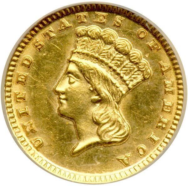 1859-D. SEGS graded MS-62. Only 4,952 pieces struck. Our grade is Sharpness of Mint State cleaned . Generally well struck for an issue that is often weak in areas. There is plenty of luster present covering both surfaces. Some light die clash marks are a hallmark of this (and other) Dahlonega Mint gold dollars. Rare in this grade.
