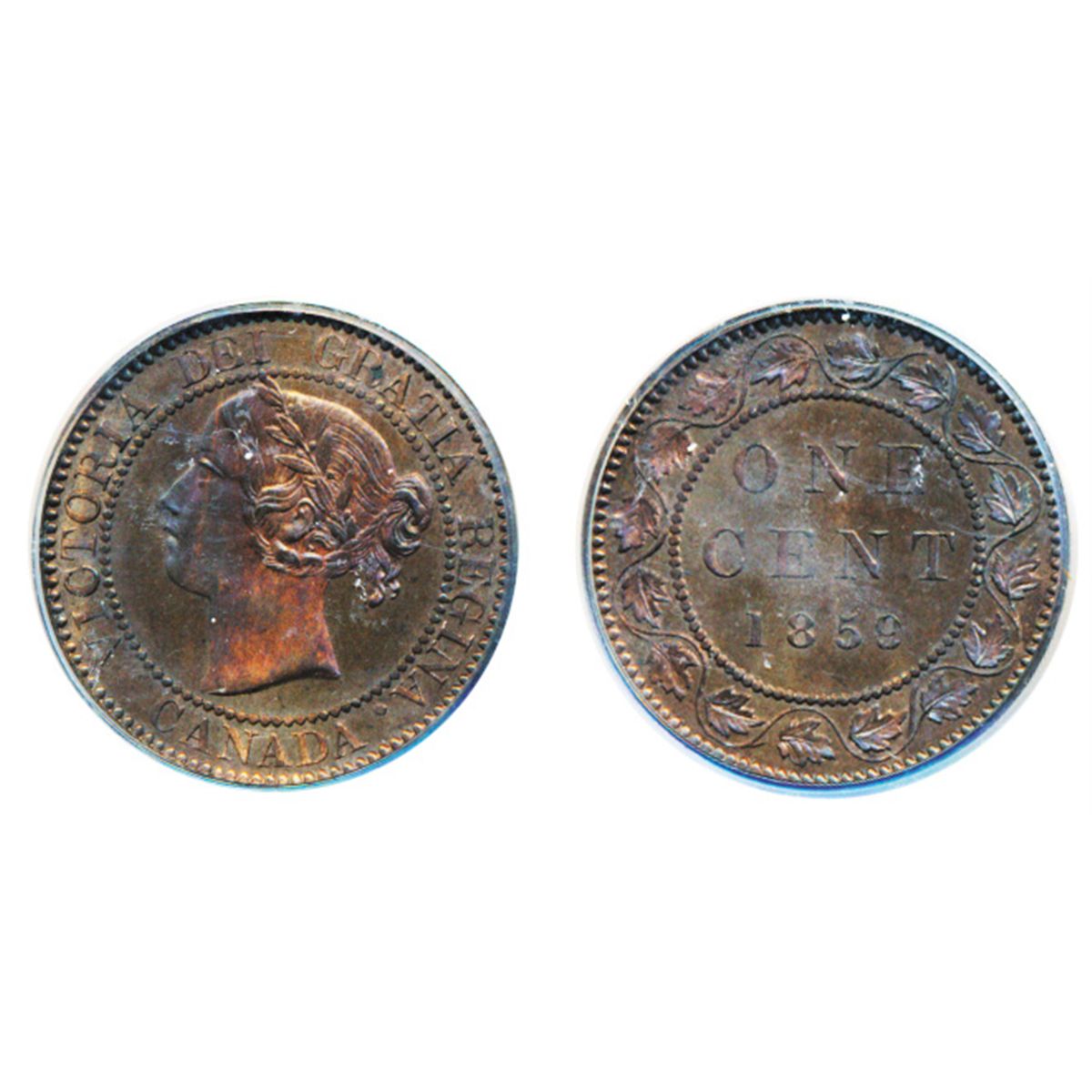 1859. Double-Punched, Narrow 9 #2. Also identified as the ‘9 over 9’ variety. PCGS graded SPECIMEN-65. Red-Brown. 20% red luster. Ex. Belzberg collection.