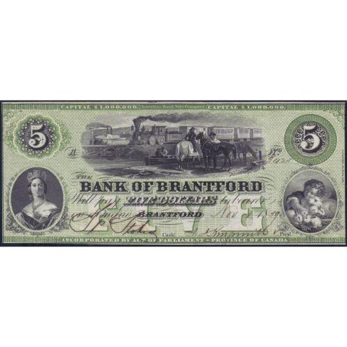 1859 Five Dollars Bank of Brantford, CH 40-10-02-08, Serial Number 3425 A, PMG Choice Uncirculated 64 Exceptional Paper Quality