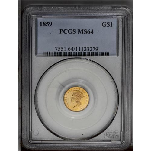 1859 G$1 MS64 PCGS. Boldly struck overall, if slightly