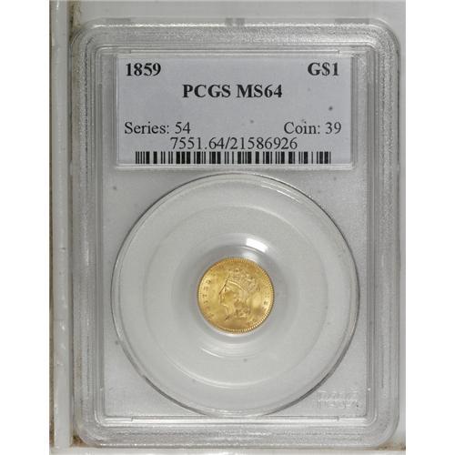 1859 G$1 MS64 PCGS. Highly lustrous with subtle shades