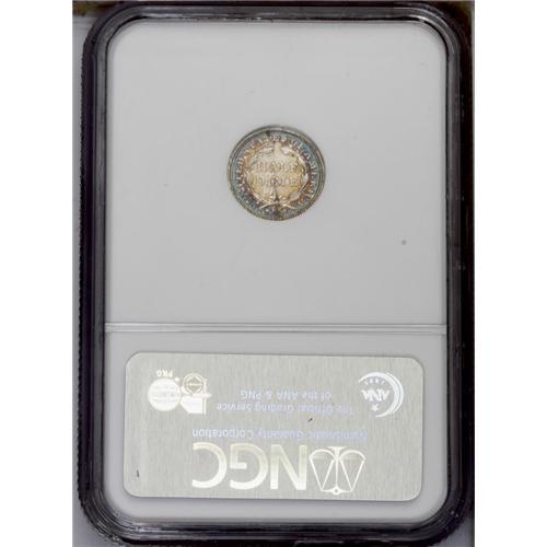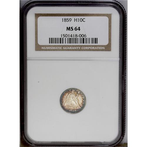 <B>1859<H10C> MS64 NGC.</B></I> Intense electric-blue and golden-brown borders frame nearly untoned centers. A few faint marks on the right obverse field deny a finer grade. The 1859 half dime is curious for its hollow-centered stars and slightly different rendition of the Seated Liberty. This obverse design only appears elsewhere on the 'transitional' 1859 and 1860 mules. <BR><BR><B>Important notice:</B> Heritage usually auctions material at the rate of 200-250 lots per hour. On some occasions eBay Live bid software or the Internet may not be able to keep up with the pace of the auction. We recommend placing a realistic absentee bid now as insurance to avoid disappointment. Occasionally the auctioneer may eliminate or reject an eBay Live bid, and the auctioneer may also reopen a lot after the close of the eBay live bidding (usually because we missed an audience bid), and may reject your bid even if it shows you as the winning bidder. By bidding via eBay Live, you agree that Heritage may award the lot to another bidder at its sole discretion under the circumstances described above or any other reasonable circumstances. Since eBay bids are not shown to us until we open the lot on the floor, we treat those bids just like floor bids. In most cases the floor responds before the eBay bid is presented to us, due to Internet lag time, so for consistency we have made it a policy that floor bids are always considered first over tie eBay live bids. Also please note that all Heritage lots purchased through eBay Live carry a 20% Buyer's Premium. Please make sure you read the Terms and Conditions before you bid. This lot is being auctioned in conjunction with a live floor auction by Heritage Galleries & Auctioneers. All final auction and invoice information will be supplied by Heritage Galleries & Auctioneers, and all other information should be considered preliminary. Lot:1897 <BR><BR><B>Winning Notification and Billing:</B> After the FINAL session in this auction is complete, Heritage will send e-mail and snail mail invoices. This process normally takes several days. All final auction and invoice information will be supplied by Heritage Galleries & Auctioneers, and all other information should be considered preliminary. <BR><BR>This auction will be conducted on a live auction floor and over the Internet through eBay Live. If you choose to place an absentee bid, please take a moment to <font color='#0000ff'><u><a href='http://pages.ebay.com/liveauctions/help/before/laabsentee.html'>learn how eBay Live absentee bidding works</a></u></font><font color='#000000'>