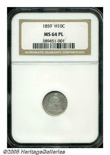 <B>1859<H10C> MS64 Prooflike NGC.</B></I> The 1859 Half Dime is often collected as a one-year type coin with hollow centers to the stars. This is a fully struck coin that displays noticeable reflective qualities under a very light coating of silver-gray patina. The 1 in the date is boldly repunched.