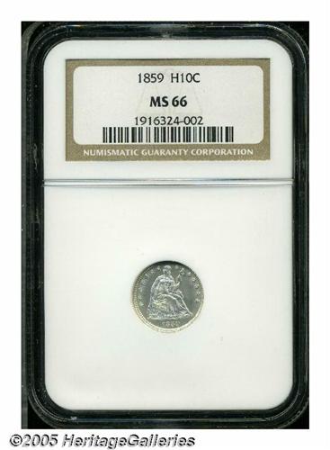 <B>1859<H10C> MS66 NGC.</B></I> The 1859 is a one-year type that has largely gone unrecognized by collectors. The redesign by Robert Ball Hughes included hollow centered stars, slimmer arms, and larger head. The surfaces are mostly brilliant with just the slightest accent of golden color around the margins. A bit softly struck on the stars and the reverse wreath, the surfaces are immaculately preserved with the only disturbance in the fields being light clash marks.