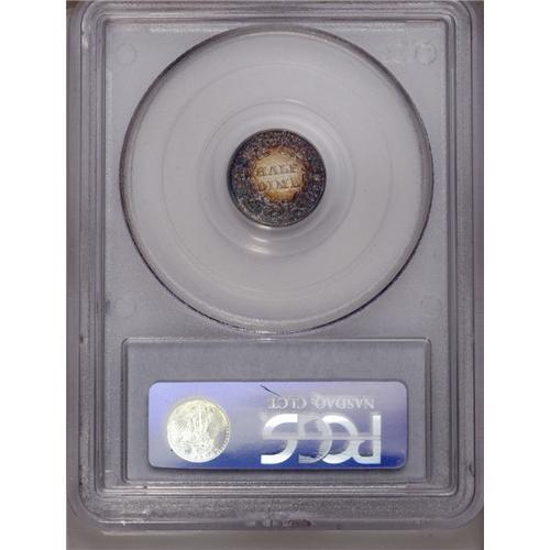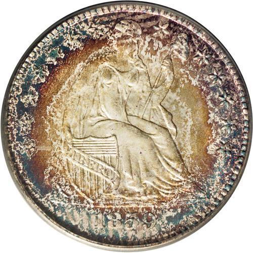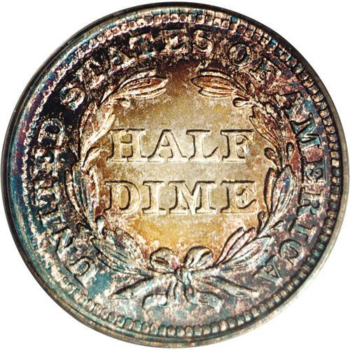 <B>1859<H10C> MS68 PCGS.</B></I> A scintillating, Superb Gem bathed in concentric hues of turquoise, rose-violet, and russet iridescence. Both the strike and surface quality appear to leave little room for improvement. The 1859 half dime was Assistant Engraver Anthony Paquet's first work to reach actual production. This remodeling of Gobrecht's original design is most often noted for the hollow centers in the stars, a design element not found on any other U.S. coin. Perhaps because the figure of Liberty itself was not well executed, or because he did not wish another engraver doing his work, Chief Engraver James Longacre remodeled the half dime again in 1860, after only 340,000 pieces of the Paquet design had been struck at the Philadelphia Mint. The uniqueness of this design earns it one-year type status, long an oversight with collectors assembling type sets. Population: 1 in 68, 0 finer (3/06).