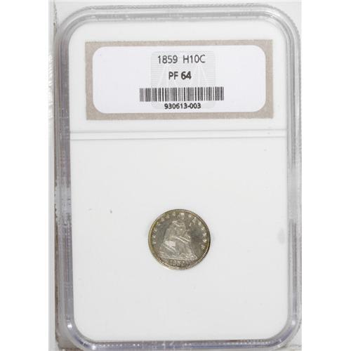 <B>1859 H10C PR64 NGC.</B></I> Deeply reflective with boldly defined devices. Pale golden toning appears on each side, while an arc of deep violet patina is noted at the lower obverse periphery.<BR><I>From The Jones Beach Collection.</B></I><BR><BR><b>Shipping:</b> Coin/Currency (<a target="_blank" href="http://www.heritageauctions.com/common/shipping.php">view shipping information</a>)