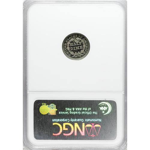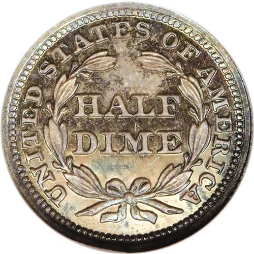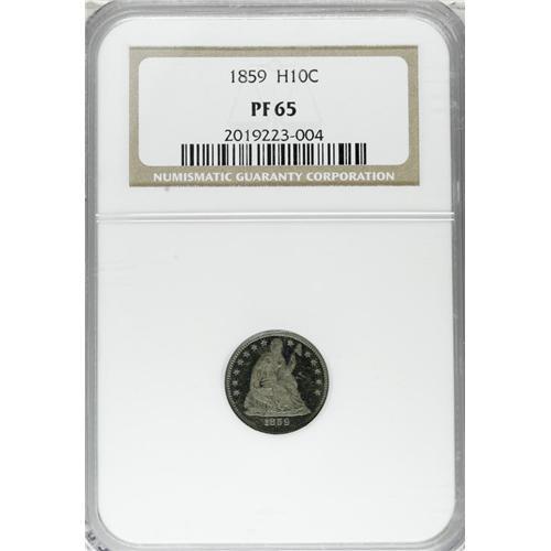 <B>1859 H10C PR65 NGC.</B></I> The 1859 half dime has been an overlooked type coin for decades. This situation is likely to continue until collectors realize that the hollow centered stars, slimmer arms, and larger head constitute a design different enough to be considered as a separate type. This is a superior type coin that is toned in electric-green and salmon hues over both sides. Repunching is evident on the base of 1 in the date. Census: 46 in 65, 24 finer (4/07).<BR><BR><b>Shipping:</b> Coins & Currency (<a target="_blank" href="http://www.heritageauctions.com/common/shipping.php">view shipping information</a>)