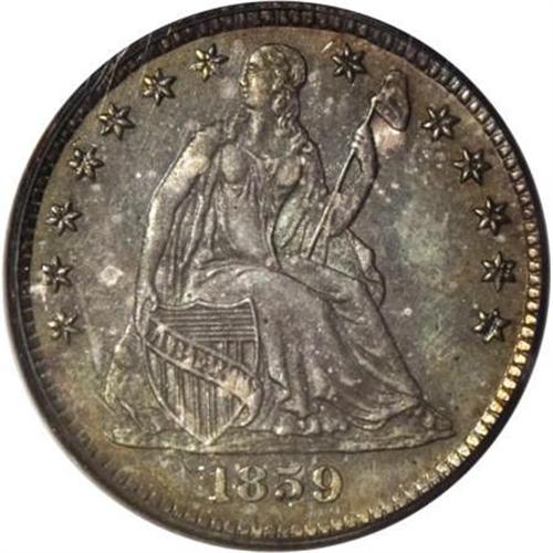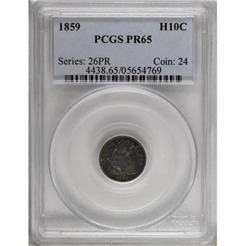 <B>1859 H10C PR65 PCGS.</B></I> Walter Breen (1988) says 800 1859 proof half dimes were minted, and PCGS/NGC population data indicate well over 300 examples have been certified. The Gem in this lot displays attractive medium gray surfaces with bluish accents. The strike is solid, and both sides are devoid of significant marks. Population: 22 in 65, 10 finer (8/07).<BR><BR><B>Coin Engraver:</B> Christian Gobrecht<BR><BR><b>Shipping:</b> Coins & Currency (<a target="_blank" href="http://www.heritageauctions.com/common/shipping.php">view shipping information</a>)