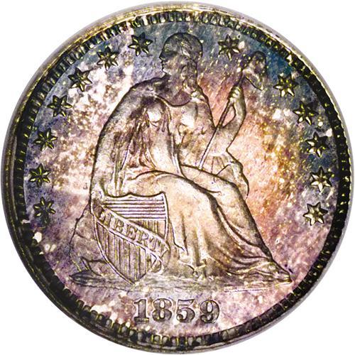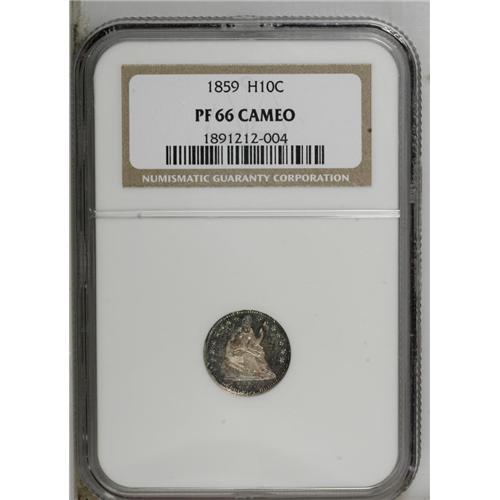 <B>1859 H10C PR66 Cameo NGC.</B></I> In his book, <I>The Complete Guide to Liberty Seated Half Dimes,</B></I> Al Blythe asserts that only 60 to 75 proofs have survived. The population figures show that only about 20 1859 proofs have been assigned the cameo designation. This coin displays cobalt-blue, lavender, and gold-tan toning, and well impressed design elements. The surfaces are devoid of significant marks. Census: 2 in 66 Cameo, 2 finer (10/06).<BR><BR><b>Shipping:</b> Coin/Currency (<a target="_blank" href="http://www.heritageauctions.com/common/shipping.php">view shipping information</a>)