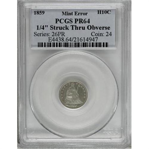 <B>1859 H10C Half Dime--1/4" Strike-Through Obverse--PR64 PCGS.</B></I> A gleaming near-Gem with thin green-inflected haze over the fields, which show light points of contact. A prominent strike-through, possibly thread, runs along the bottom digits of the date. An interesting specimen.<BR><BR><B>Coin Engraver:</B> Christian Gobrecht<BR><BR><b>Shipping:</b> Coins & Currency (<a target="_blank" href="http://www.heritageauctions.com/common/shipping.php">view shipping information</a>)